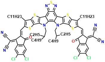 Y6-EH-4Cl 2,2’-((2Z,2’Z)-((12,13-Bis(2-ethylhexyl)-3,9-diundecyl-12,13-dihydro-[1,2,5]thiadiazolo[3,4-e]thieno-[2”,3’’:4’,5’]-thieno[2’,3’:4,5]pyrrolo[3,2-g]thieno-[2’,3’:4,5]thieno[3,2-b]-indole-2,10-diyl)bis(methanylylidene))-bis(5,6-dichloro-3-oxo-2,3-dihydro-1H-indene-2,1-diylidene))dimalononitrile